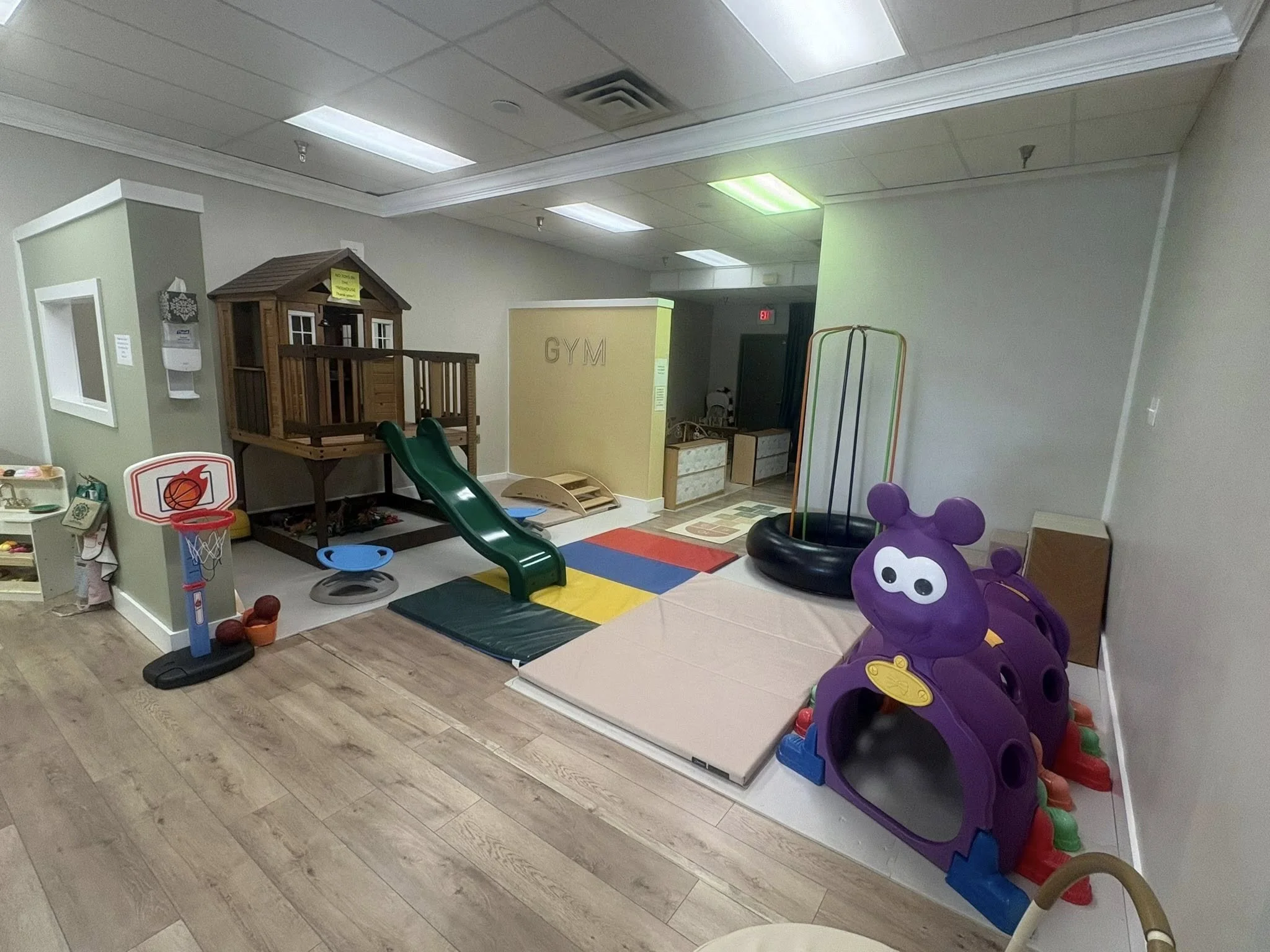 The gym area is a dynamic space designed to combine active play with physical fitness in a safe and engaging environment to enjoy physical activity year-round. Soft flooring and padded surfaces ensure safety.